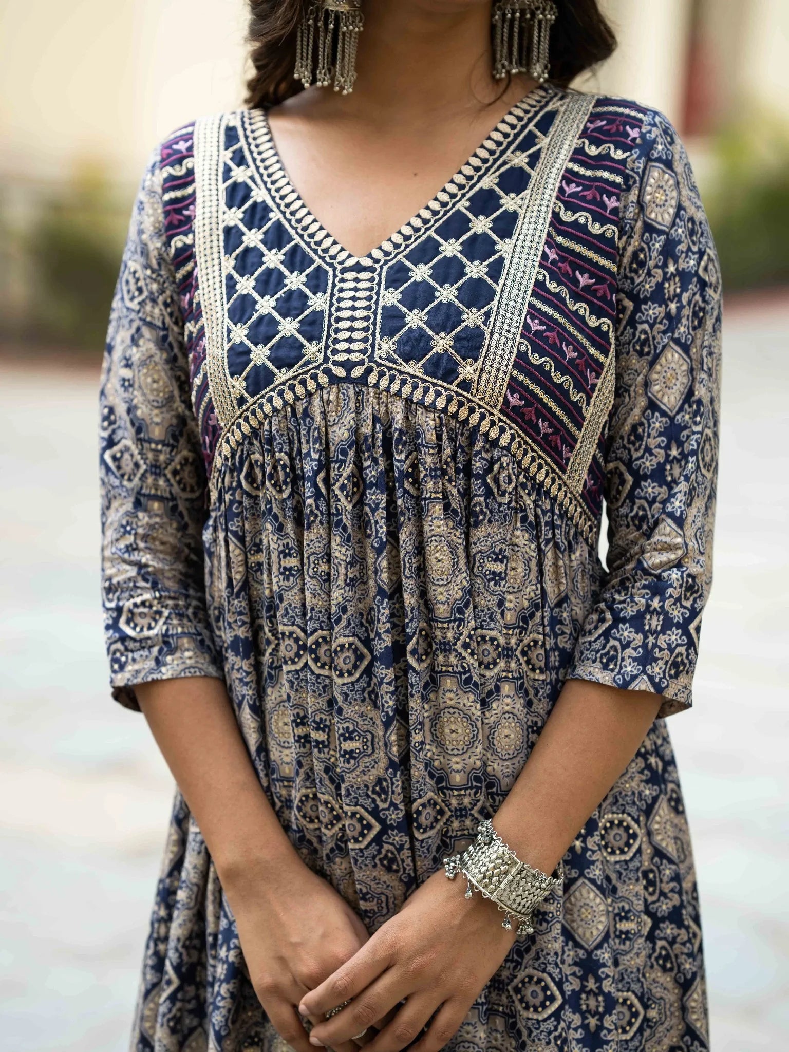 - Neckline: Embroidered V-neckline.